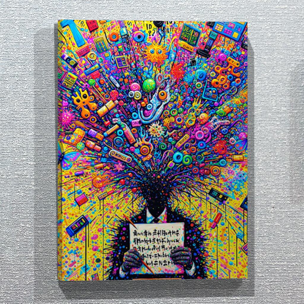 こちらの作品は、頭の中に無秩序に流れ込む情報、感情、記憶、そしてノイズが爆発する瞬間を描いたものです。「 知ること」 は、本当に豊かさなのか?それとも、ただ消耗しているだけなのか?情報に支配される現代人の姿を皮肉とともに可視化した作品です。
