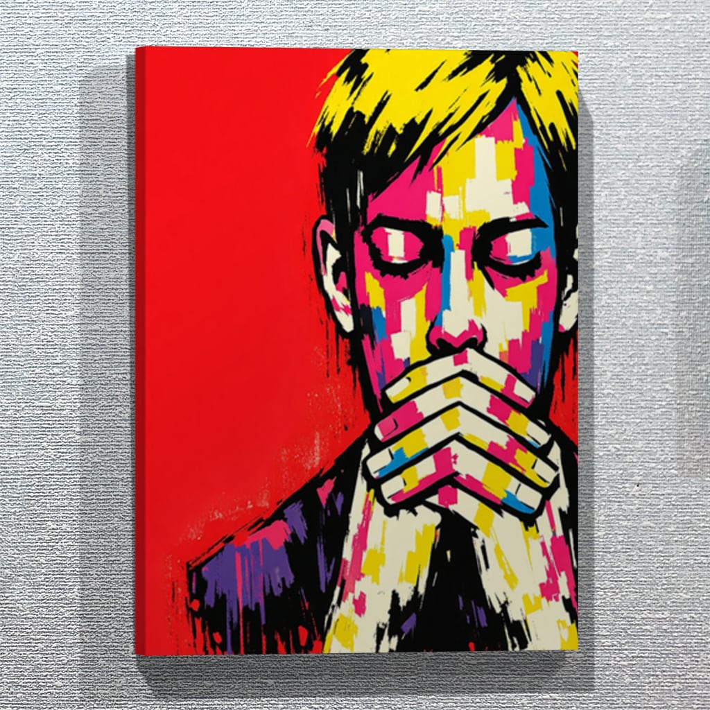 口を覆う手は、" トラブル回避 " という名の万能アイテム。赤い背景は「 ここから先は空気を読んでください」という無言のサイン。