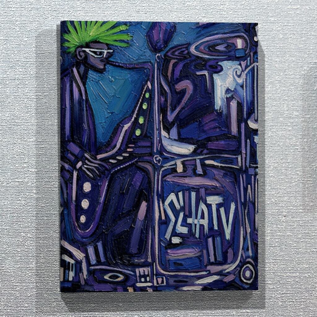紫とインディゴの厚塗り感が、沈黙の中で燃えるように重なり、緑の髪が冷たい炎のように揺れる。