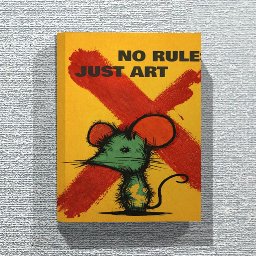 「 NO RULES, JUST ART - ルールなし、ただアート 」とは、わたしのアートに対する理念を象徴する言葉です。その理念をマウスをモチーフにして作成したファブリックパネルです。